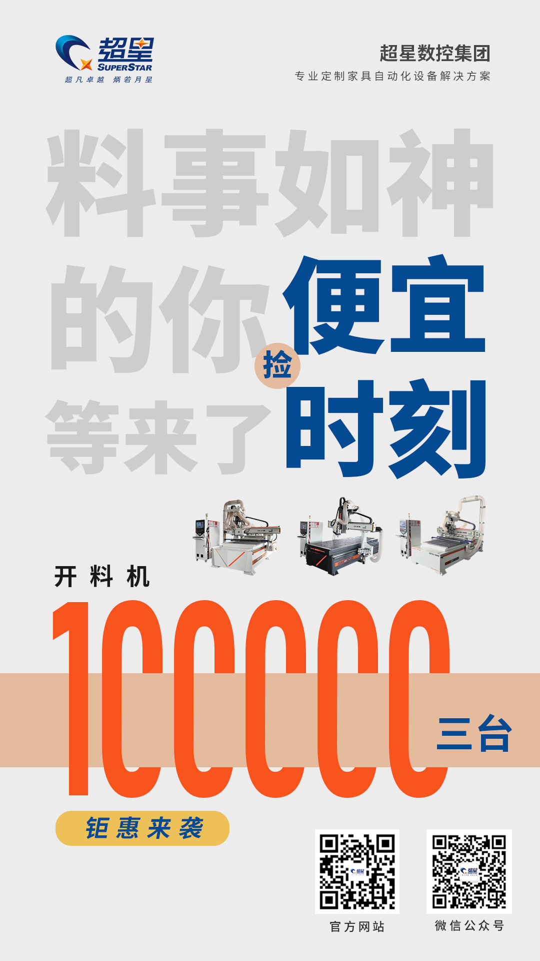 2025年9月9日至12日,超星數控將攜兩款創新產品,重磅亮相中國(上海)國際家具生產設備及木工機械展覽會,此次參展,超星數控將推出“十萬三臺開料機”的鉅惠活動,以此回饋新老客戶一直以來的支持和信任。
